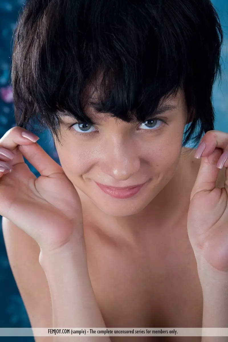 Брюнетка Taja Femjoy показывает стриженную письку и горячие сиськи на синем фоне — Taja Femjoy